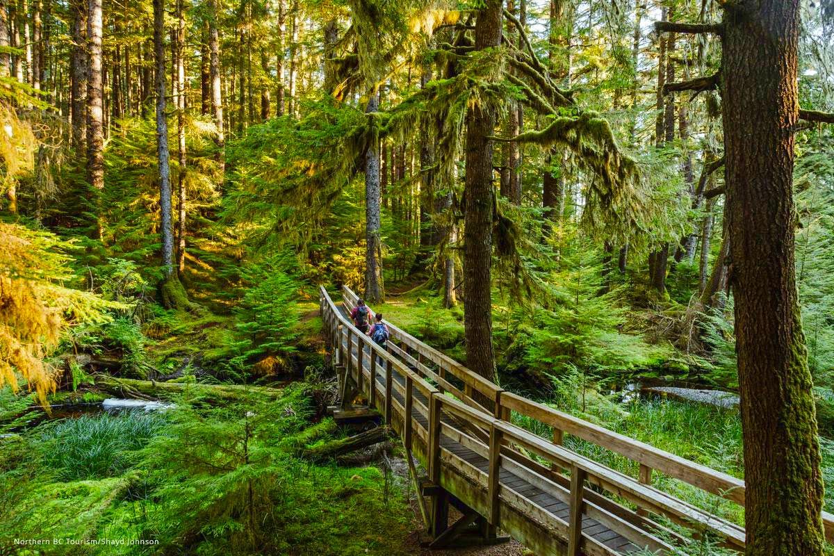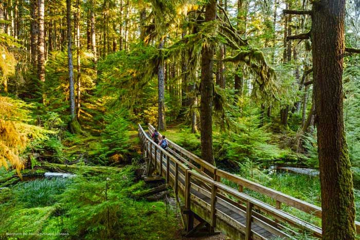 In the coastal rainforests, trails meander through towering, centuries-old trees draped in moss, beside crystal-clear streams and cascading waterfalls. The undergrowth is lush and vibrant, providing a vivid display of greens that are especially captivating in the misty rain that the area is known for.