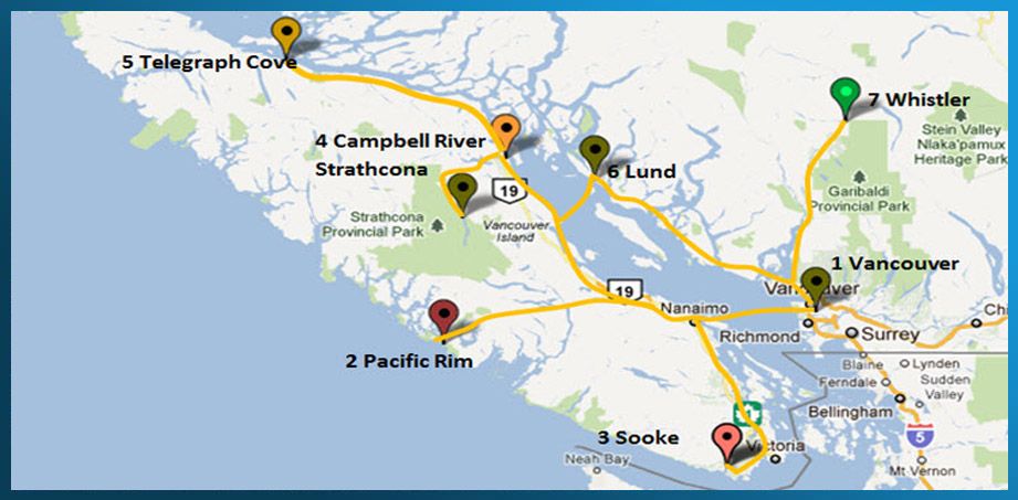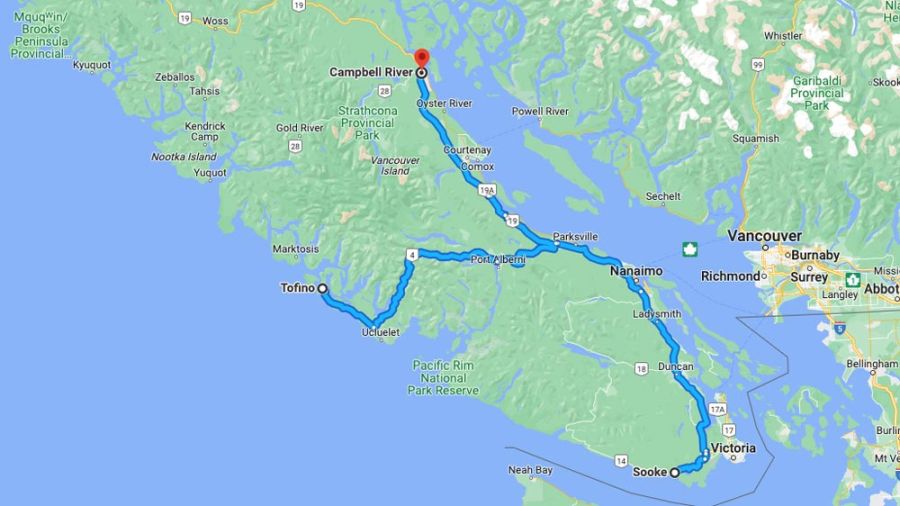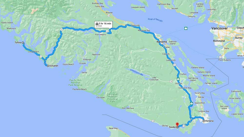 From Vancouver (Tsawwassen): Take a ferry Swartz Bay, and then enjoy a 1.5 hour drive to Sooke, or a 45 mins drive to Victoria.