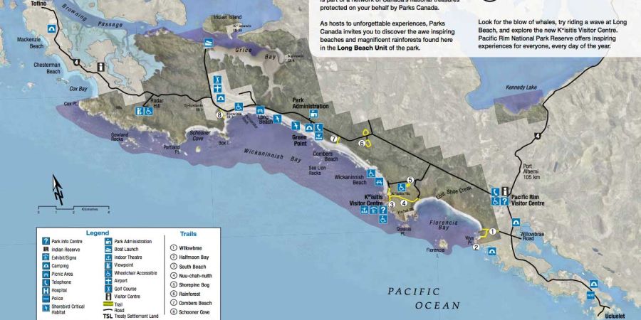Famous for its expansive sandy beaches, over 100 hundred small islands and inlets, pounding surf, and lush coastal rainforest. The area provides excellent opportunities for beachcombing, surfing, hiking, and wildlife viewing. The interpretive center at the Kwisitis Visitor Centre offers educational displays and programs to help visitors learn about the park's ecology and cultural history.